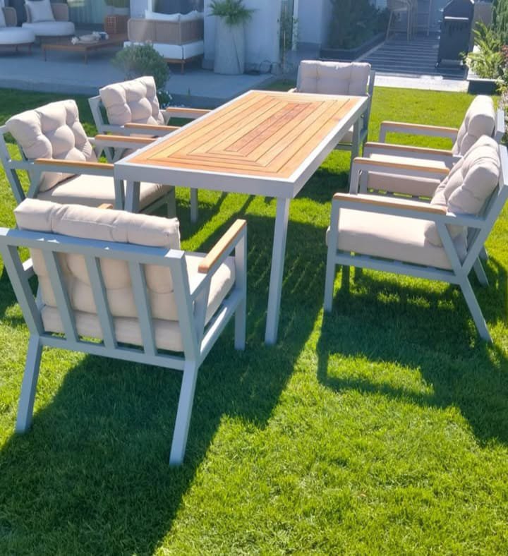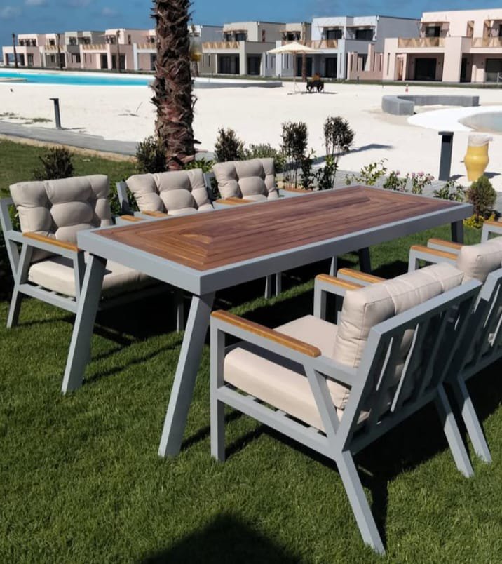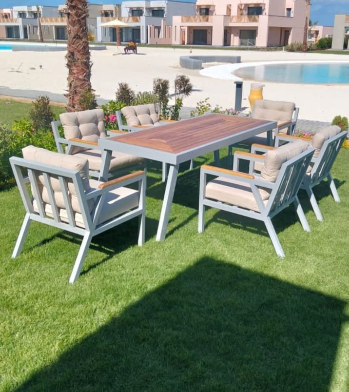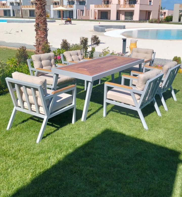من 6 كراسي وترابيزة، المصممة لتجمع بين المتانة والشكل العصري، وتتحمل أقسى الظروف الجوية.
