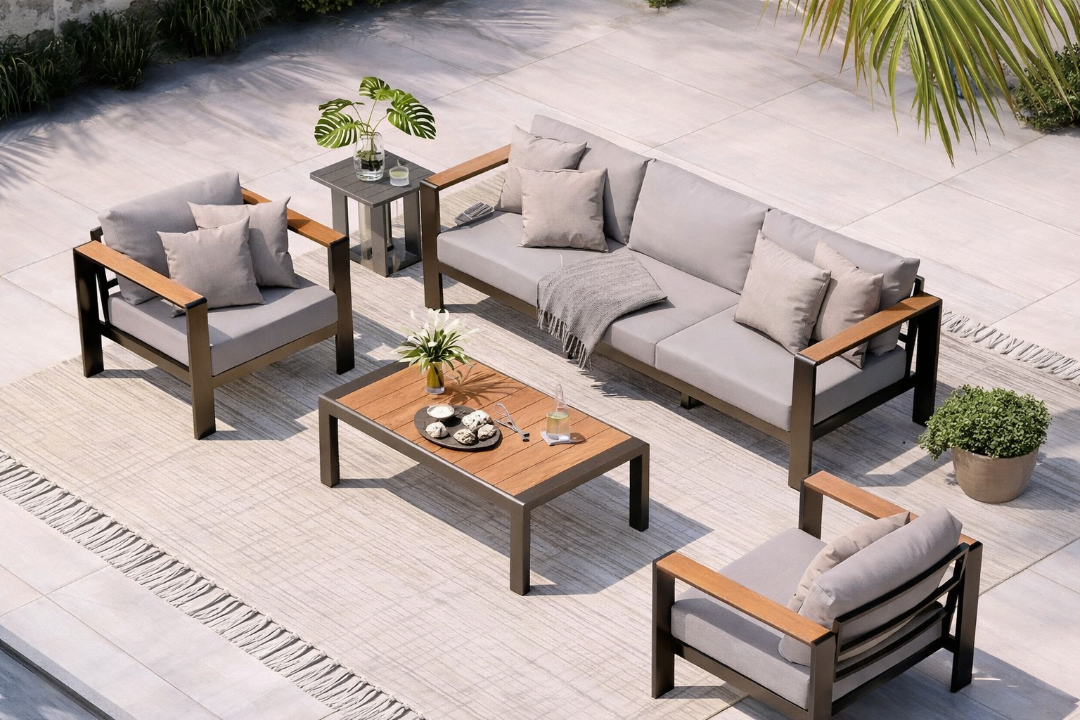 هذا الطقم يجمع بين التصميم العصري والقوة العملية ليكون اختيارًا مثاليًا لكل من يبحث عن أثاث خارجي فاخر يتحمل الاستخدام اليومي والظروف القاسية.